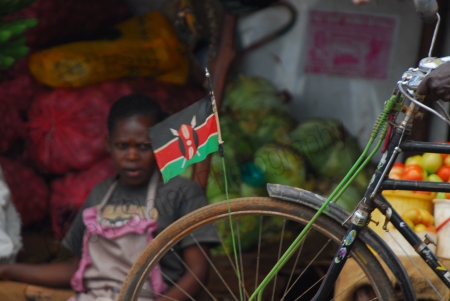 I took this photo when I was having to wait along side the busy road between Nairobi and Mombasa for a bus to take the other people in the van I was traveling with to Mombasa for the rest of the holiday while I headed back to Nairobi. I used my telephoto lens from inside the van I was in to take this photo of a woman waiting for a customer that pulled up on his bicycle with the Kenyan flag on the front fender to enter her roadside fruit and vegetable shop.