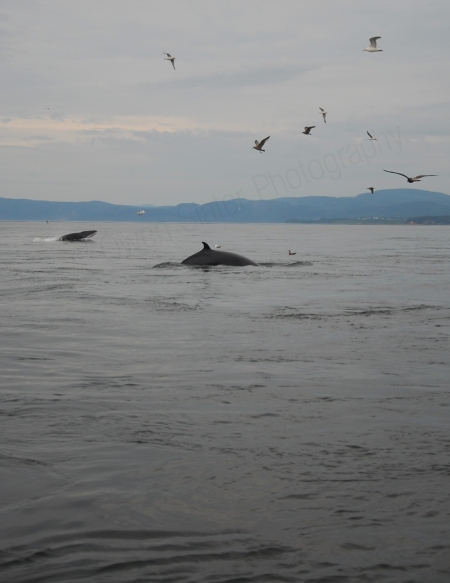 Apparently the St. Lawrence estuary is still a relatively unknown location for whale watching at this time of year (though they get about 1.1 million visitors per year), which is surprising given how numerous the whales are during August through September. A total of 13 different whale species can be seen in the estuary. They come for the abundant food created by the nutrient rich, cold, oxygen saturated waters. In under two hours we spotted minke, fin, and beluga whales as well as grey seal and harbor porpoise. With the early morning start (7am) we were the only boat around, the waters were calm and the whales were actively feeding. This photo, as with many, was a bit of good luck. With the wide angle lens on the camera focused on the closet whale, the one in the background burst through the water just as the photo was taken and captured the head and white chin of these whales.