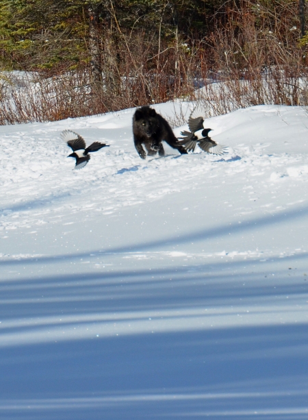 While the ravens gave up, two magpies decided to give it a try but with quickly put in their place by the wolf, who drove them off with a sudden burst that nearly resulted in the demise of a magpie