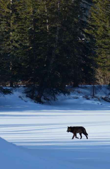 With the bone buried under the snow, the wolf trots off along the frozen bow river to catch up with the rest of the pack.