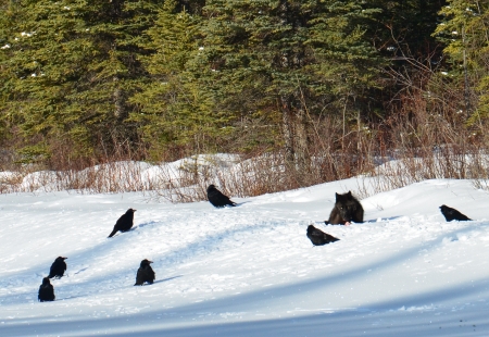 After a few games of chase the raven, a young adult wolf sits down to enjoy it’s bone. The ravens kept their distance, each with just enough room between the wolf and each other to get airborne in time to avoid capture.