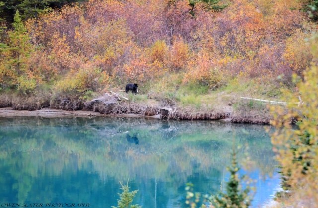 In October, with the fall colours at their height, I came across this seven month old wolf pup making its way along the banks of this river. Since I was on foot, I quickly hid behind a tree to not be spotted. Luckily the wind direction was in my favour as well. Without knowing I was there, it stopped and appeared to look at its reflection in the turquoise waters, rooted around for some rodents and then I thought it would disappear into the thicket. However, it came around the corner and started trotting towards me. I crouched down on the ground and stopped taking photos to not give my position away, as the faint sound of the camera would have easily been picked up my the wolf. It proceeded to walk about 30 feet from me before it rounded another corner and went out of sight.
