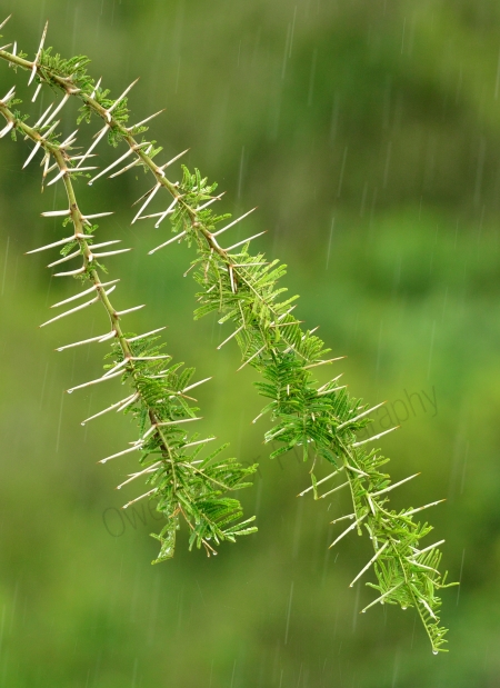 Maasai giraffe in the background, with a traditional Maasai shuka (cloth blanket) hung out to dry on an acacia tree.