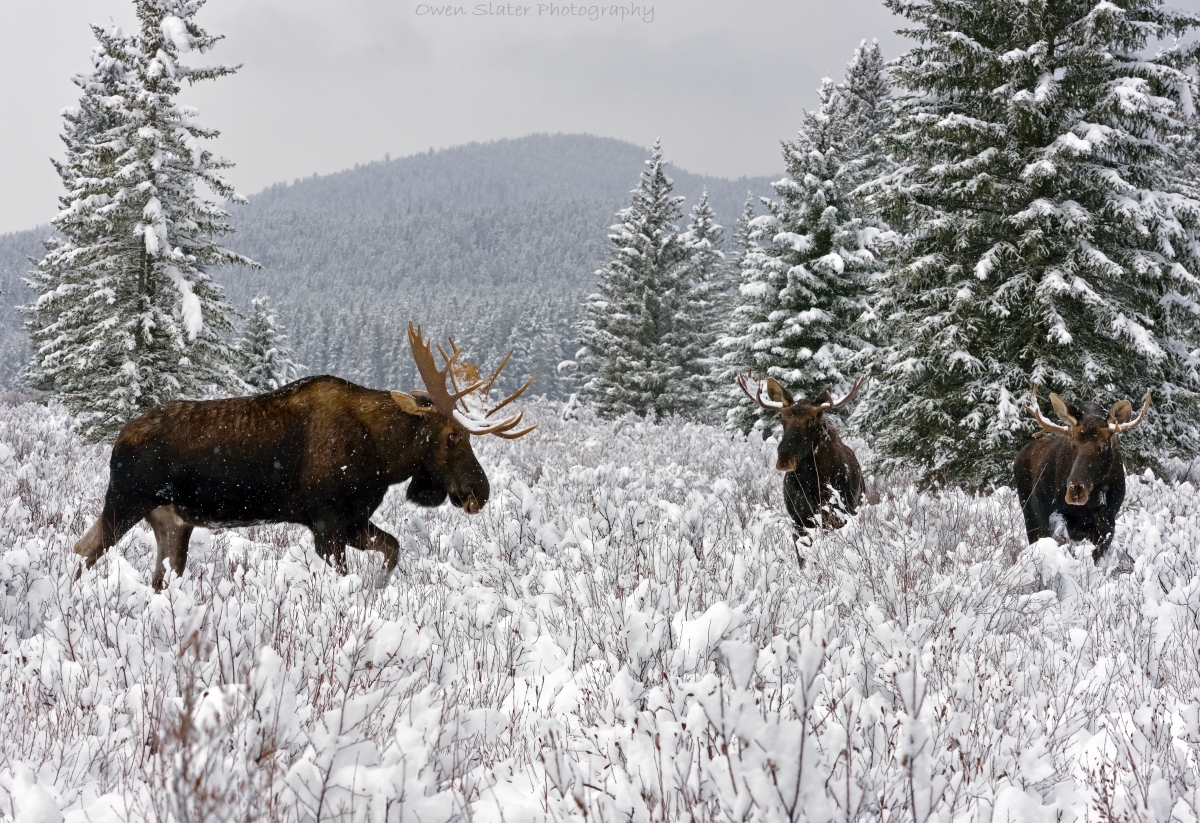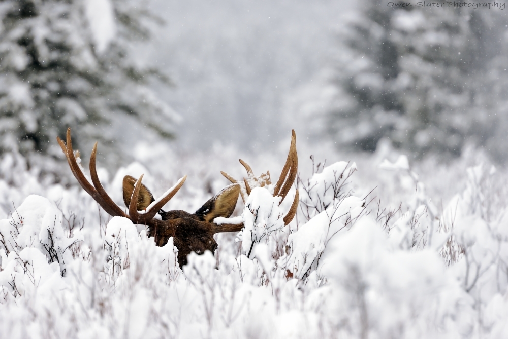 It’s relatively rare to see moose in the Rockies. I see more wolves and bears than I see moose, but late fall and early winter always seem to be good times to run into them. You would think it wouldn’t be hard to find them when they weigh around 500kg and stand about 2.5 meters tall at the shoulder, but this bull was only given away by his prominent set of antlers while he bedded down during a snow storm.