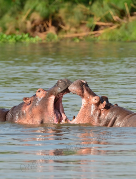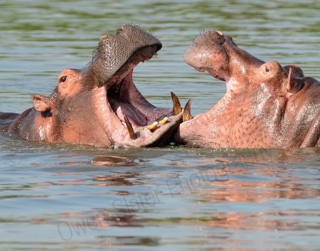 Two male hippos square off in a battle for dominance. All hippos are very territorial and males have to fight off younger challengers to breed with females. Most bull males have a small territory with about 10 females living in the pod.
