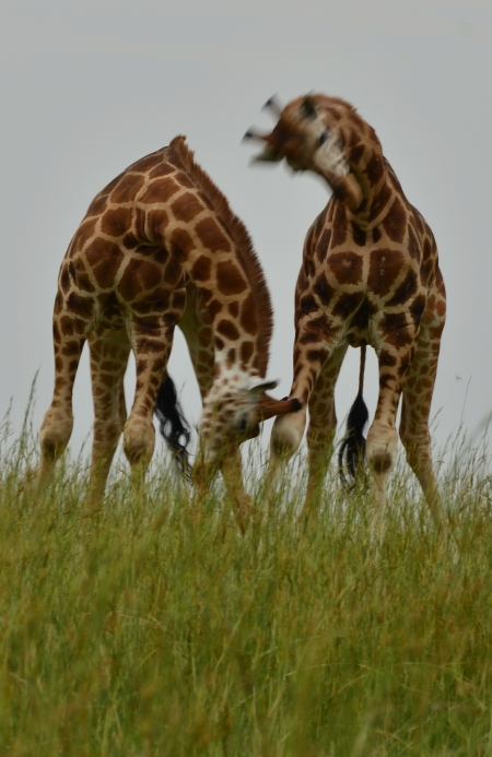 Two young male giraffe lines up and smash their heads against each other in Murchison Falls National Park.