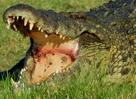 Our boat slowly floated in to the edge of the shore to get a closer look at this huge crocodile. It was atleast 15 feet long and it’s mouth was big enough to swallow me whole. The red area in the mouth is where the gular valve is located, which prevents water from going down the trachea when the animal is under water. On land they hold their mouths open to dissipate heat and to get their teeth cleaned by brave birds and insects.