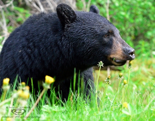 This spring has been mainly overcast with lots of rain and cool days which has extended the dandelion season in many areas of Banff National Park. Here a black bear pauses between dandelions before sticking out its upper lip to pluck off the head of the next flower. With such a short growing season in the Rockies the bears are in a constant state of looking for and eating as much food as possible. Even then, they typically are much smaller than bears found elsewhere in Alberta and across Canada.